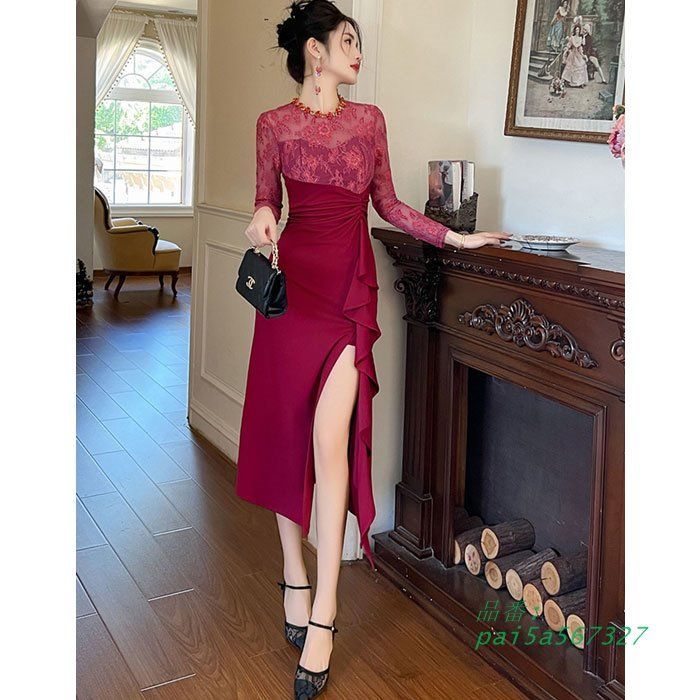 ハイウエストギャザー スリットスカート 長袖膝丈ワンピース 赤 結婚式 お呼ばれ 服 パーティー 韓国 レディース pai5a715412