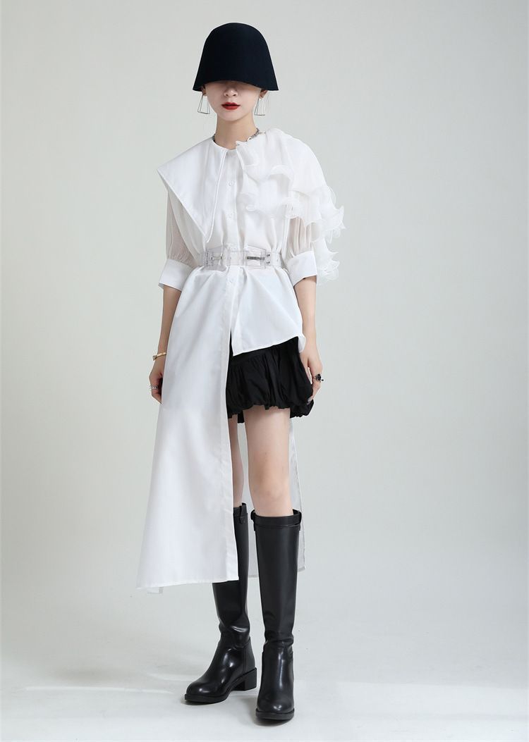 アシンメトリー シャツワンピース 袖丈2TYPE選べる ボリューム裾 デザイン 個性的 レディース 春 夏 秋 冬 五分袖 長袖 襟付き ロングシャツワンピース フリル 二の腕カバー 変形 デザイン zhongc01 BLACKFEMALETHERAPIST_ORG