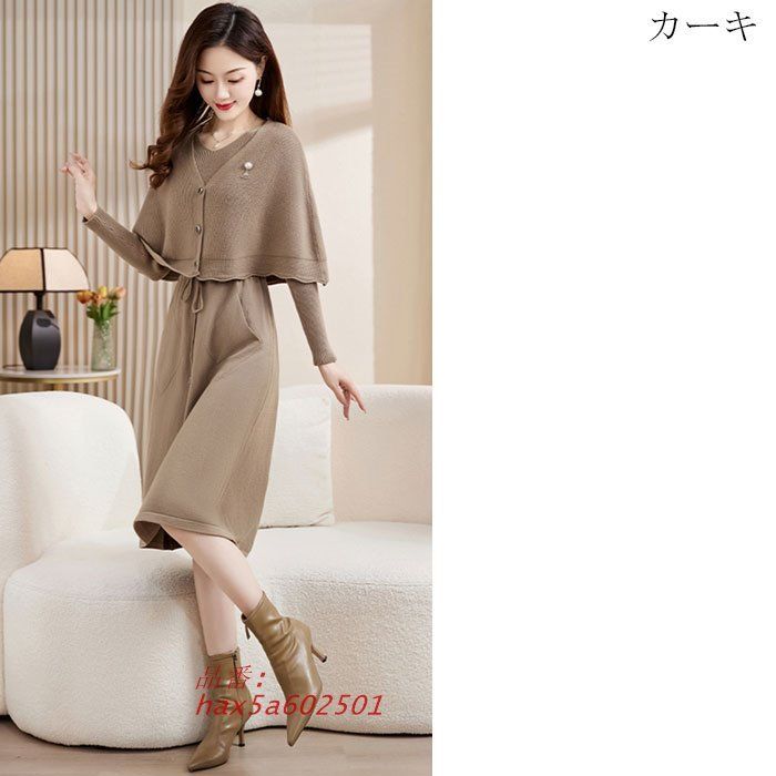 カーディガン風ケープ付き 膝丈長袖ニットワンピース 赤 カーキ 茶 カジュアル 服装 韓国 レディース デート hax5a602501の検索結果
