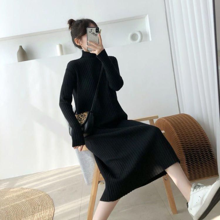 ニットワンピース レディース リブニット 長袖 ハイネック セーター 体型カバー ロング丈 Iライン ロングセーター ストレッチ シンプル ナチュラル カジュアル フェミニン 春 秋 冬 pdd9703 BLACKFEMALETHERAPIST_ORG
