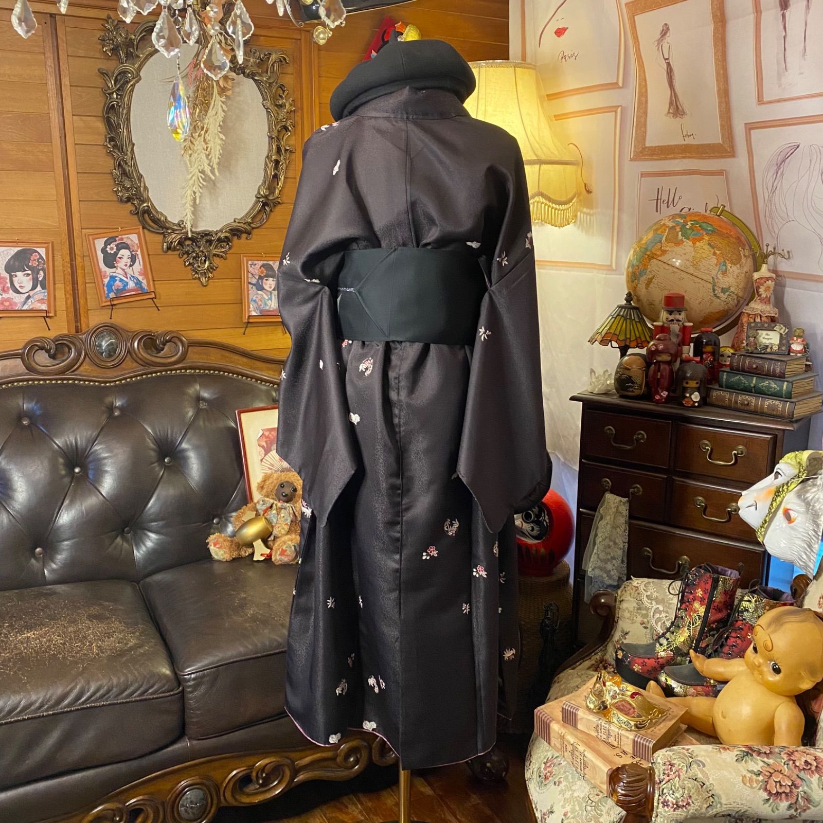 着物リメイク セミロング ワンピース|洗える化繊素材&名古屋帯サッシュベルト付き レトロ 古着 ハンドメイド 深い黒紫 葡萄黒 KW-1076 BLACKFEMALETHERAPIST_ORG