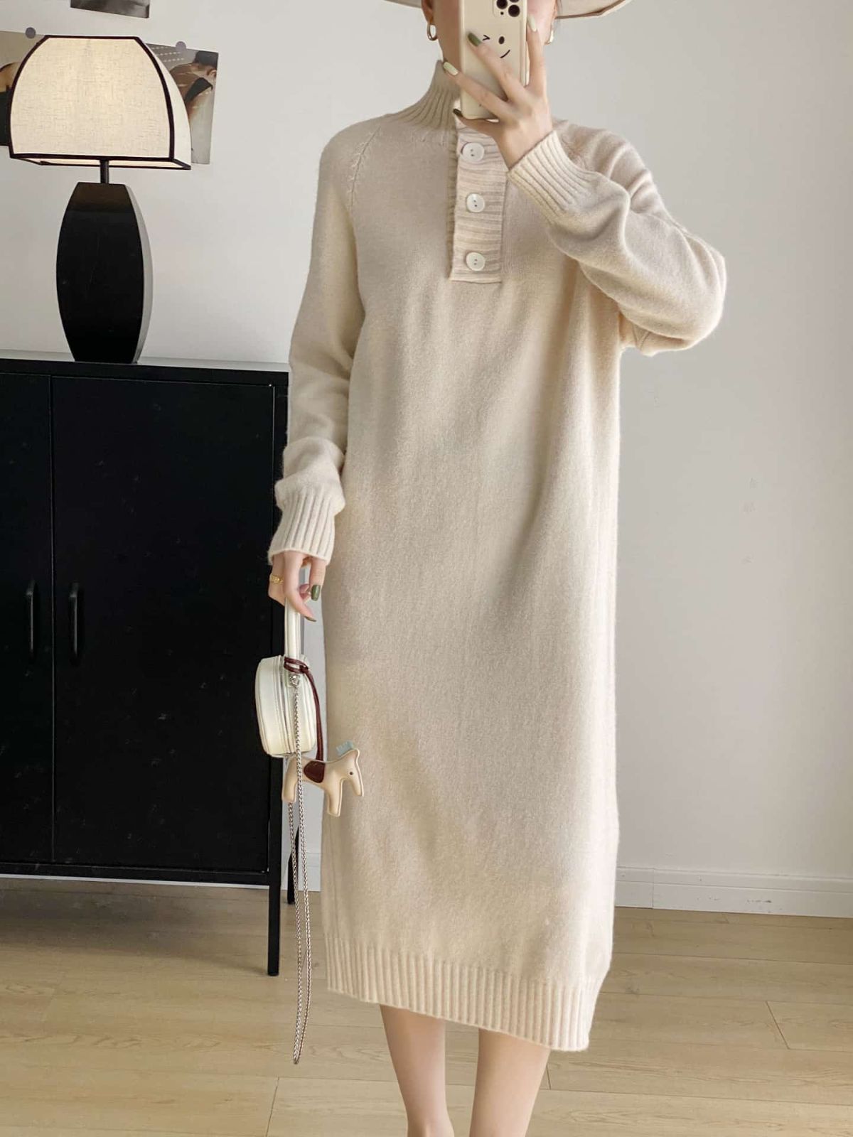 ロングニットワンピース 秋冬 即 OK ニットワンピース Aライン ハイネック ボタン 厚手 暖かい 保温 防寒服 ゆったり 体型カバー 長袖 上品 きれいめ シンプル 体型カバー 無地 伸縮性 洗える ルームgelitai13 BLACKFEMALETHERAPIST_ORG