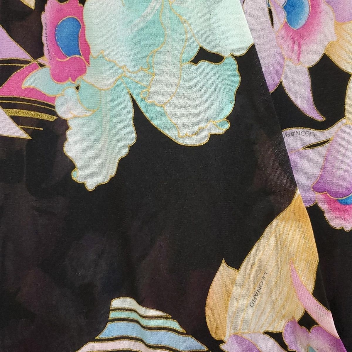 LEONARD レオナール ワンピース サイズ3 L レディース - 黒×パープル×マルチ クルーネック 半袖 ひざ丈 カンカン素材 花柄 BLACKFEMALETHERAPIST_ORG