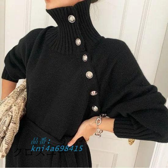ニットワンピース 冬 ロング タイト 大きいサイズ 秋冬 女子会 ハイネック 体型カバー ゆったり デート ボタンスリット 大人かわいい ウエストリボン kni4a698415 BLACKFEMALETHERAPIST_ORG