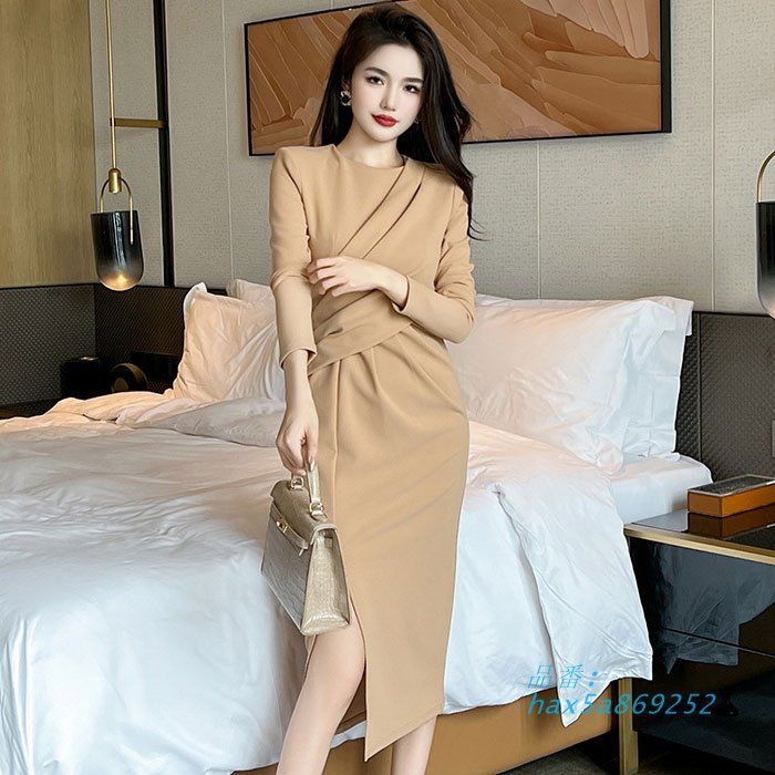 ハイウエストギャザー スリットスカート 長袖膝丈ワンピース ベージュ 結婚式 お呼ばれ 服 セレモニー レディース 韓国 hax5a869252 BLACKFEMALETHERAPIST_ORG