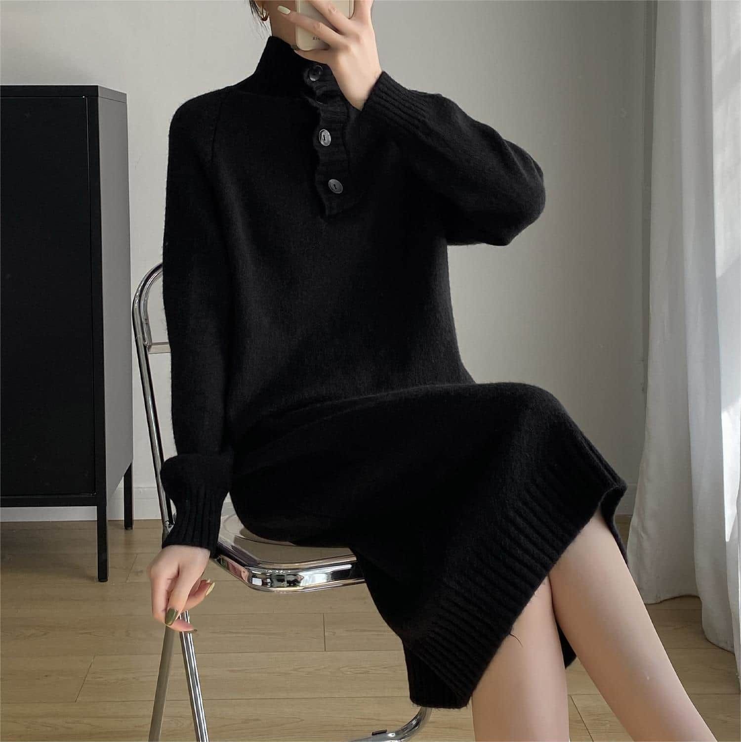 ロングニットワンピース 秋冬 即 OK ニットワンピース Aライン ハイネック ボタン 厚手 暖かい 保温 防寒服 ゆったり 体型カバー 長袖 上品 きれいめ シンプル 体型カバー 無地 伸縮性 洗える ルームgelitai13 BLACKFEMALETHERAPIST_ORG