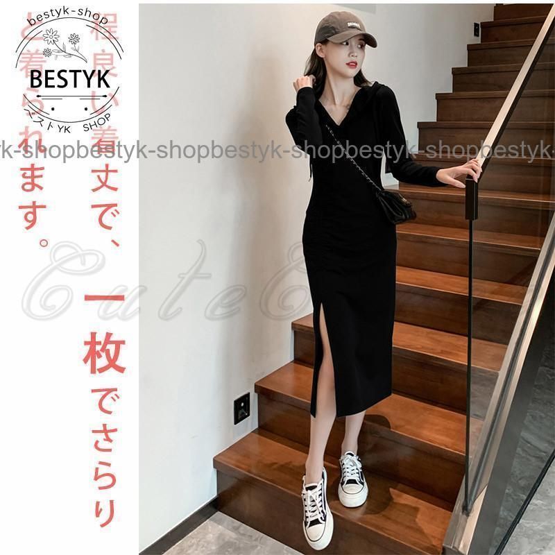ワンピース レディース フード付き 長袖 トレーナー 美スタイル設計 スリット付き Vネック お洒落 スタイルアップ ファッション 軽量 柔らかい BLACKFEMALETHERAPIST_ORG