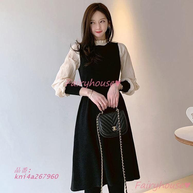 ニットワンピース レディース 40代 きれいめ 膝丈ワンピース 秋冬 Aラインスカート パフスリーブ 長袖ワンピース 黒ニット オシャレ韓国風 大人ゆったり kni4a267960 BLACKFEMALETHERAPIST_ORG