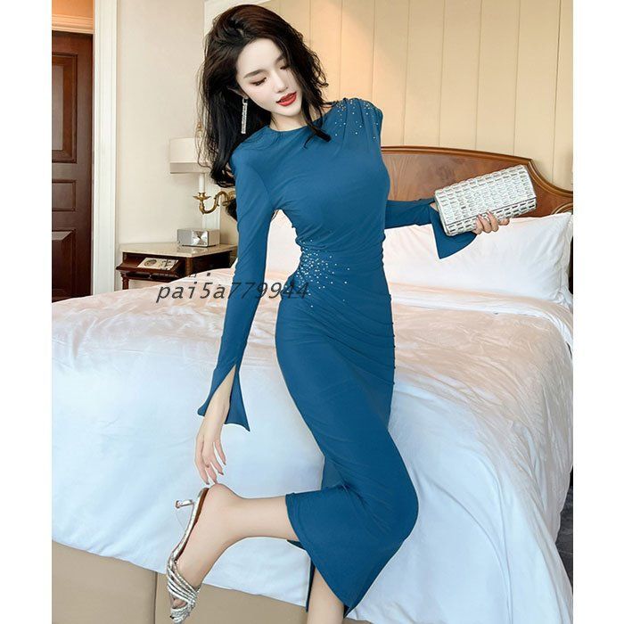 ウエストギャザー ビジュー 長袖ロングタイトワンピース 青 セクシー タイトワンピース ドレス キャバ レディース 韓国 スナック pai5a779944 BLACKFEMALETHERAPIST_ORG