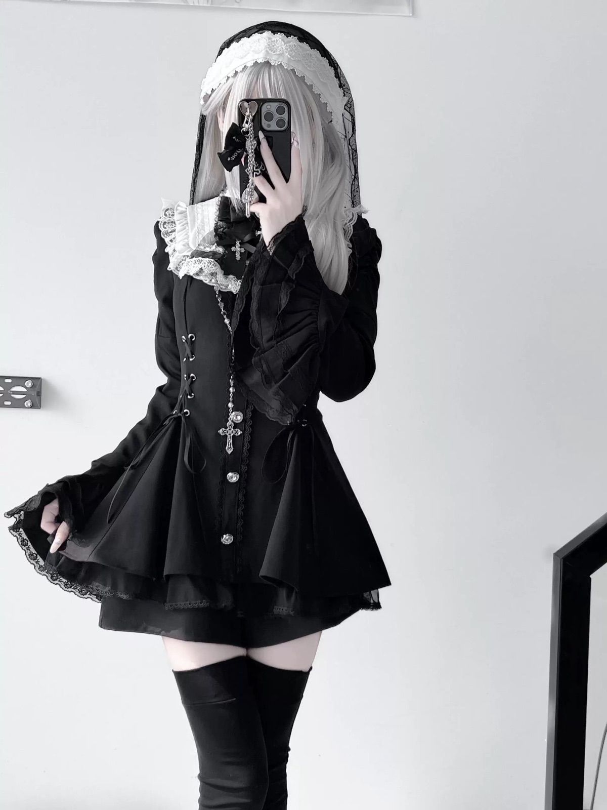 ゴシック ロリータ サブカル ワンピース セットアップ レース ベール 十字架 ネックレス付き ブラック 修道女風 コスプレ 衣装 ダーク アイドル 地雷系 病みかわいい モード 原宿系 長袖 フ ショート丈 スカート 黒 韓国ファッション BLACKFEMALETHERAPIST_ORG