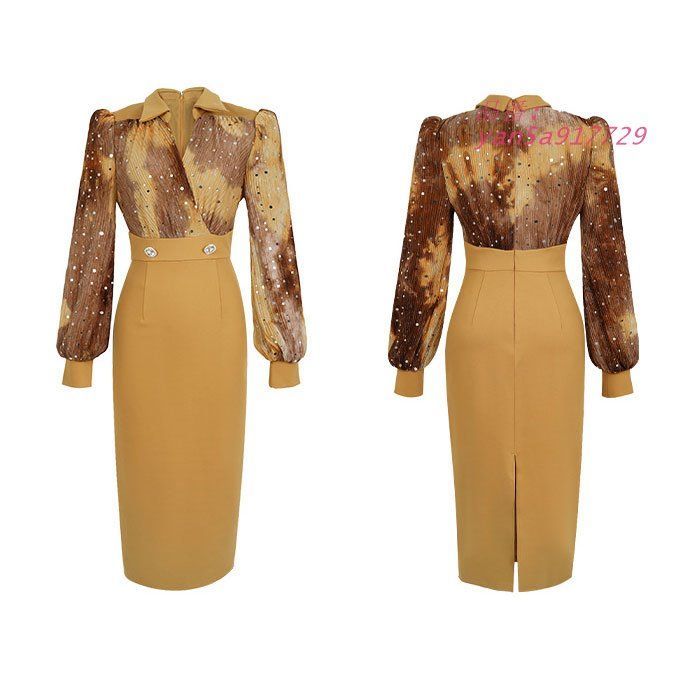 襟付き長袖ブラウス風トップ ミモレ丈タイトワンピース 黄 キャバ スナック レディース 服 韓国 yan5a917729 BLACKFEMALETHERAPIST_ORG
