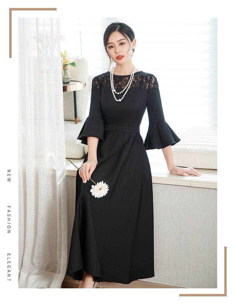 ベルスリーブ刺繍長袖 シースルーロングタイトワンピース 黒 結婚式 お呼ばれ パーティー おしゃれ 韓国 きれいめ ドレス hax5a401132