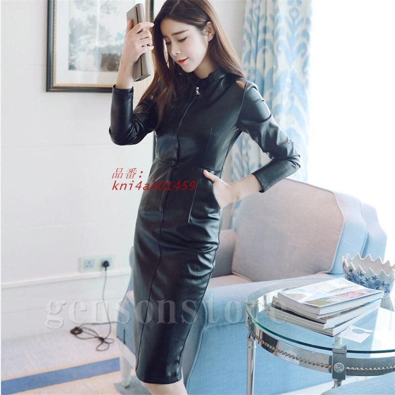 ワンピース きれいめ 長袖 タイト フォーマル 韓国 秋 フェイクレザー 春 上品 冬 レザーワンピ スリット 膝丈 S 2XL 前開きワンピース 仕事 体型カバー 通勤 kni4a501459 BLACKFEMALETHERAPIST_ORG
