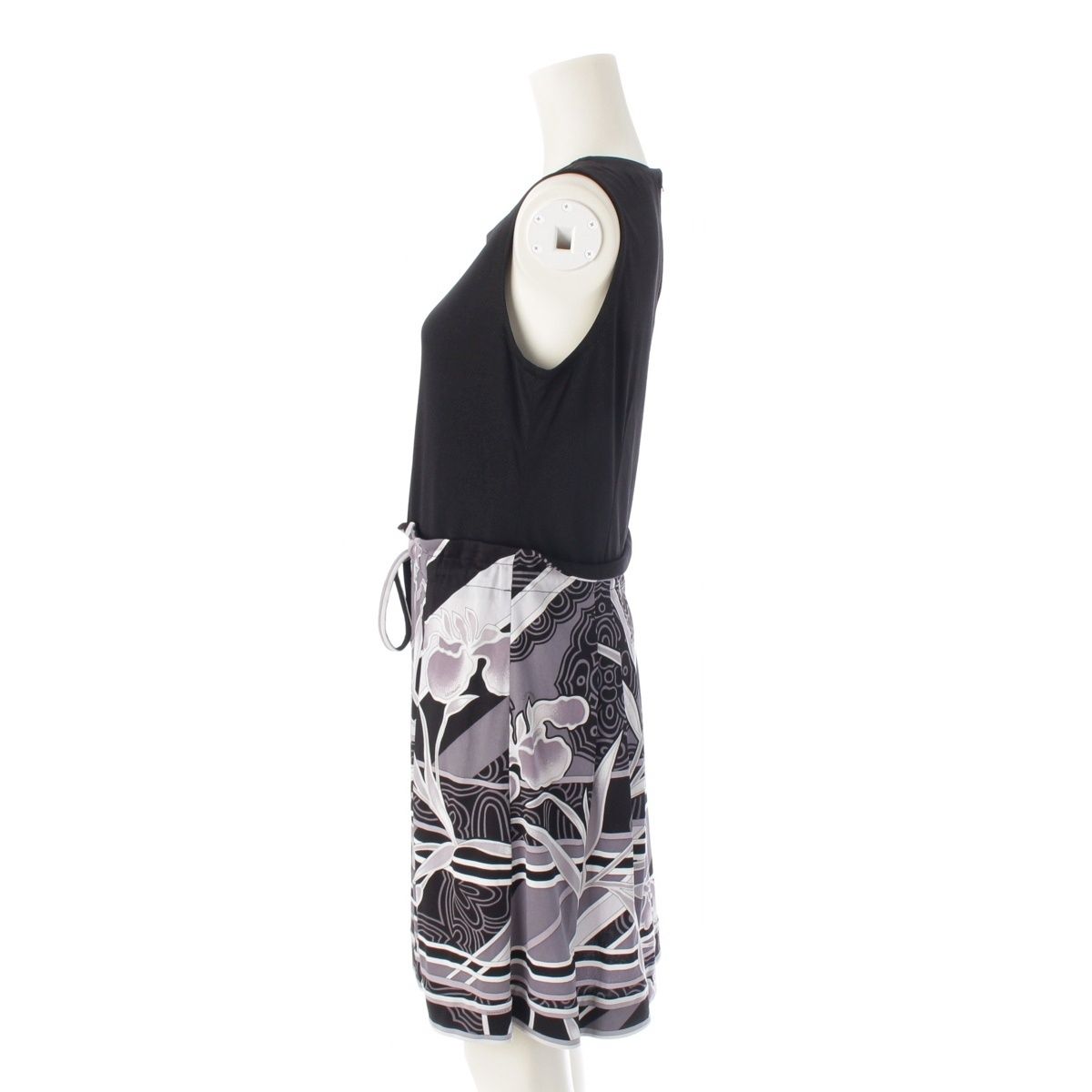 レオナール アセテート×ポリエステル カンカン ノースリーブ フラワー 花柄 切替 ドローコード ワンピース ドレス 0170253 ブラック グレー 38 BLACKFEMALETHERAPIST_ORG