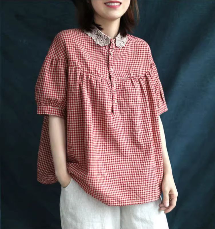 ブラウス 夏 レディース レース襟ブラウス ギンガムチェック 半袖 ブラウス コットン トップス プルオーバー 綿 チェック柄 ナチュラル 森ガール Tシャツ キレイめ 大きいサイズ ゆったり 体型カバー 夏 大人 BLACKFEMALETHERAPIST_ORG