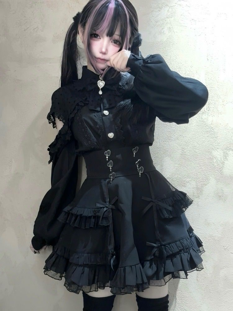 黒 ブラック 肩出し ゴスロリ 量産型 ガーリー サブカル 服 ワンピース ロリィタ 長袖 コスプレ セットアップ 地雷系 渋谷 原宿 姫 病みかわいい レース お嬢 リボン 夢かわいい 推し活 あざと BLACKFEMALETHERAPIST_ORG