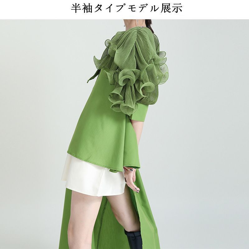アシンメトリー シャツワンピース 袖丈2TYPE選べる ボリューム裾 デザイン 個性的 レディース 春 夏 秋 冬 五分袖 長袖 襟付き ロングシャツワンピース フリル 二の腕カバー 変形 デザイン zhongc01 BLACKFEMALETHERAPIST_ORG