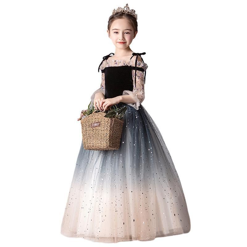 ドレス子供長袖キッズ発表会ピアノフォーマルチュールワンピースフ ワンピースロングワンピース女の子キラキラーふんわり感 BLACKFEMALETHERAPIST_ORG