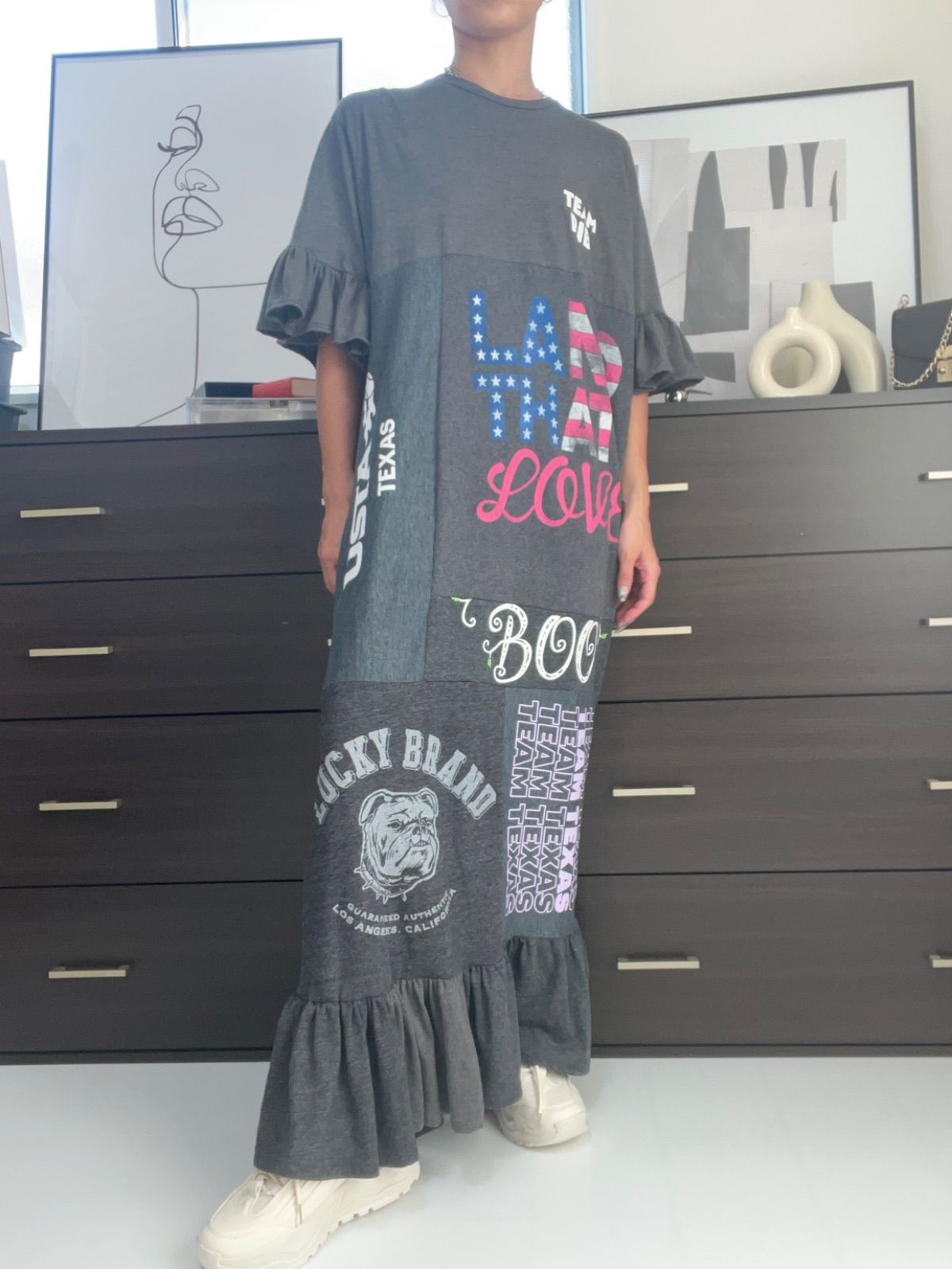 リメイク古着 remakeードッキングワンピース 半袖ロングワンピース ロゴT グレーの検索結果
