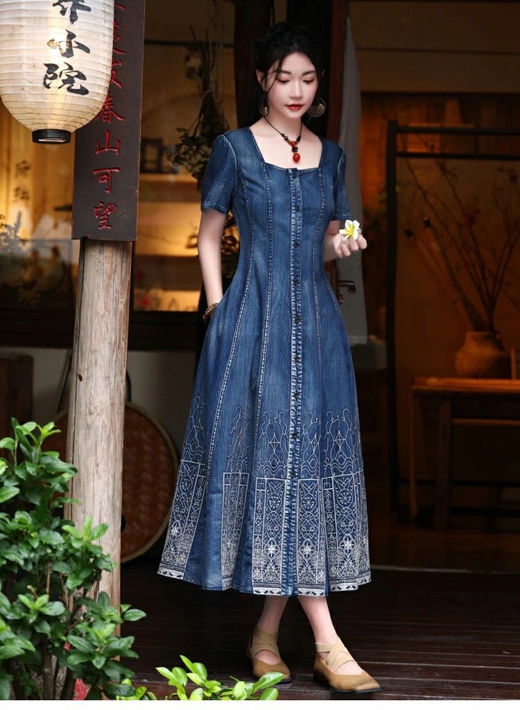 春夏 ガウンワンピース レディースワンピース 刺繍ワンピース デニムワンピース エスニック レトロワンピース スクエアネック ロングワンピース きれいめ 前開きボタン 半袖 大人かわいい 30代 40代 50代 ブルー M-2XLの検索結果