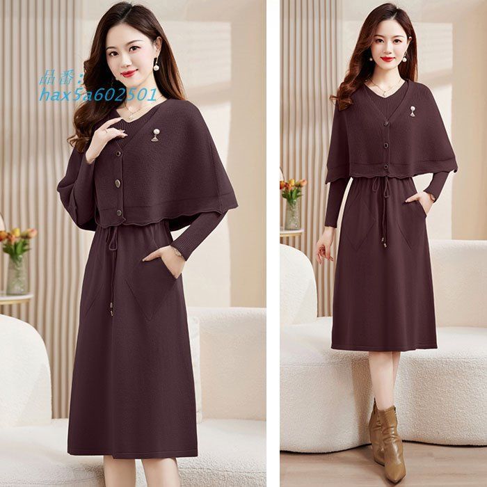 カーディガン風ケープ付き 膝丈長袖ニットワンピース 赤 カーキ 茶 カジュアル 服装 韓国 レディース デート hax5a602501の検索結果