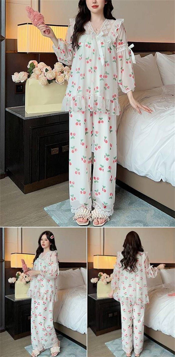 カップ付き 2点セット ルームウェア レディース チェリー サクランボ レース Vネック フリル パジャマ 長袖 薄手 ロング パンツ 上下セット パンツセットmayの検索結果