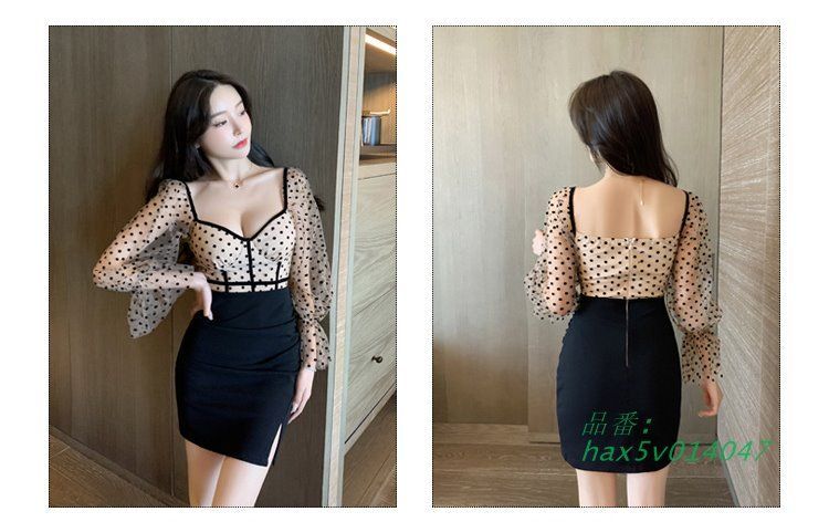 セクシー深Vネック 深スリット長袖膝丈タイトワンピース 黒 キャバ スナック ラウンジ 韓国 レディース ドレス ファッション hax5v146887