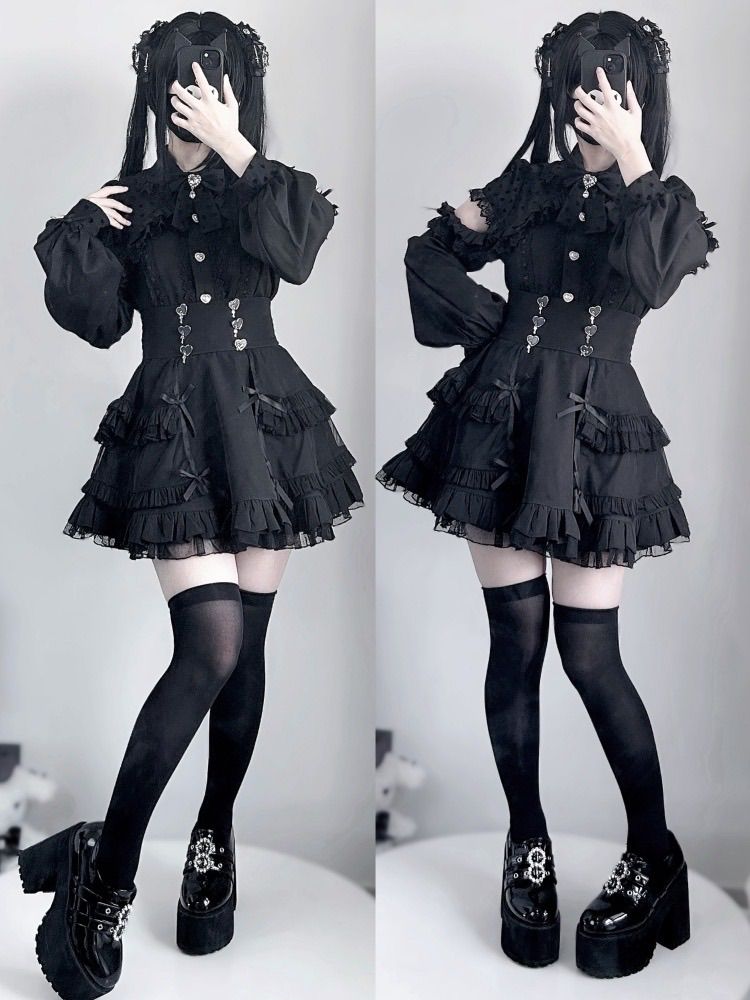 黒 ブラック 肩出し ゴスロリ 量産型 ガーリー サブカル 服 ワンピース ロリィタ 長袖 コスプレ セットアップ 地雷系 渋谷 原宿 姫 病みかわいい レース お嬢 リボン 夢かわいい 推し活 あざと BLACKFEMALETHERAPIST_ORG