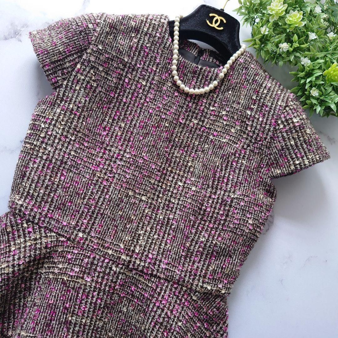 19AW YOKO CHAN ヨーコチャン Tweed Baroon Dress ミックスツイード バルーン ドレス ワンピース 半袖 キャップスリーブ クルーネック 半袖 膝丈 タック ブラウングレー ピンク マルチ 36 S BLACKFEMALETHERAPIST_ORG