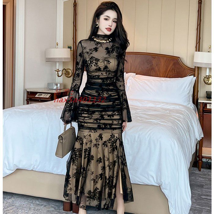 ベルスリーブ刺繍長袖 シースルーロングタイトワンピース 黒 結婚式 お呼ばれ パーティー おしゃれ 韓国 きれいめ ドレス hax5a401132 BLACKFEMALETHERAPIST_ORG