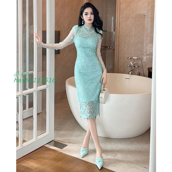 シースルー長袖 総レース刺繍仕立て膝丈タイトドレスワンピース 水色 結婚式 お呼ばれ パーティー 韓国 ドレス hax5v115616の検索結果