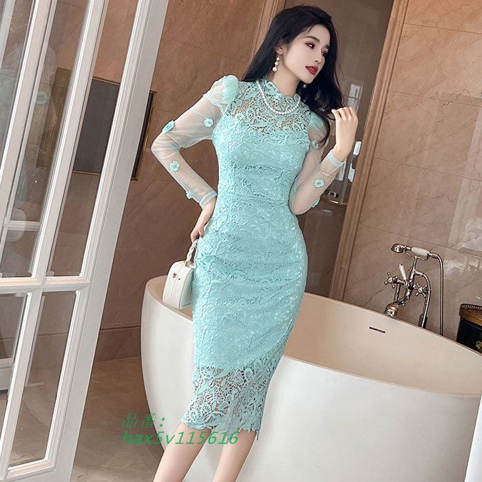 シースルー長袖 総レース刺繍仕立て膝丈タイトドレスワンピース 水色 結婚式 お呼ばれ パーティー 韓国 ドレス hax5v115616 BLACKFEMALETHERAPIST_ORG
