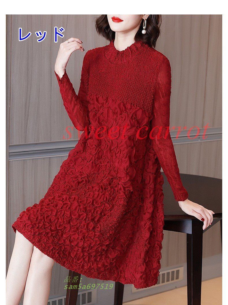 ショルダーゆったり加工 ウエストギャザーミモレ丈長袖タイトワンピース 赤 ピンク 結婚式 お呼ばれ 韓国 パーティー vii4w631786