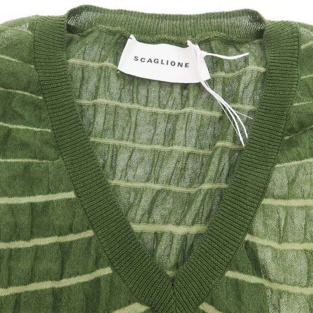 アウトレット スカリオーネ SCAGLIONE ストレッチ コットンナイロン ボーダー Vネック ノースリーブ ニットワンピース モスグリーンxライトグリーン サイズS 紙タグ表記 レディース BLACKFEMALETHERAPIST_ORG