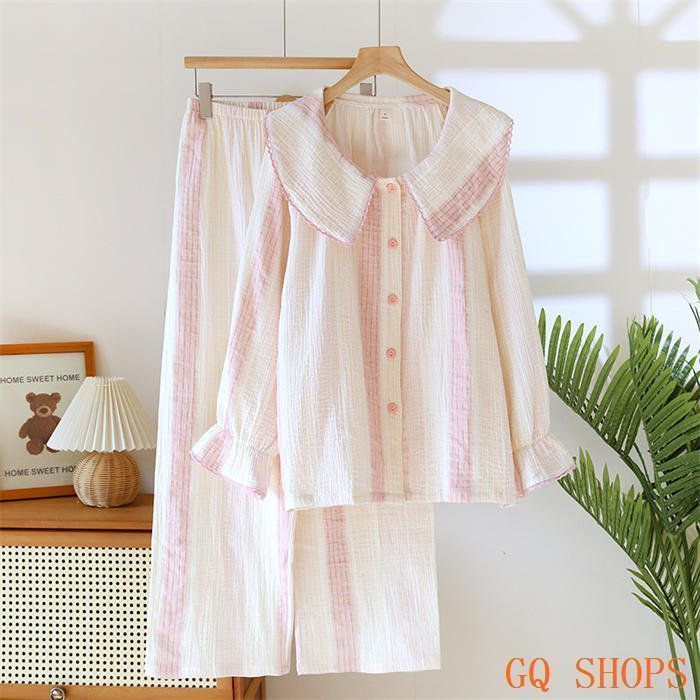 ガーゼ パジャマ レディース 大きめ 襟付き レース ダブルガーゼ ルームウェア 春 秋 冬 長袖 ロングパンツ ウエストゴム 部屋着 セットアップ 2点セット 寝間着xz0523 BLACKFEMALETHERAPIST_ORG