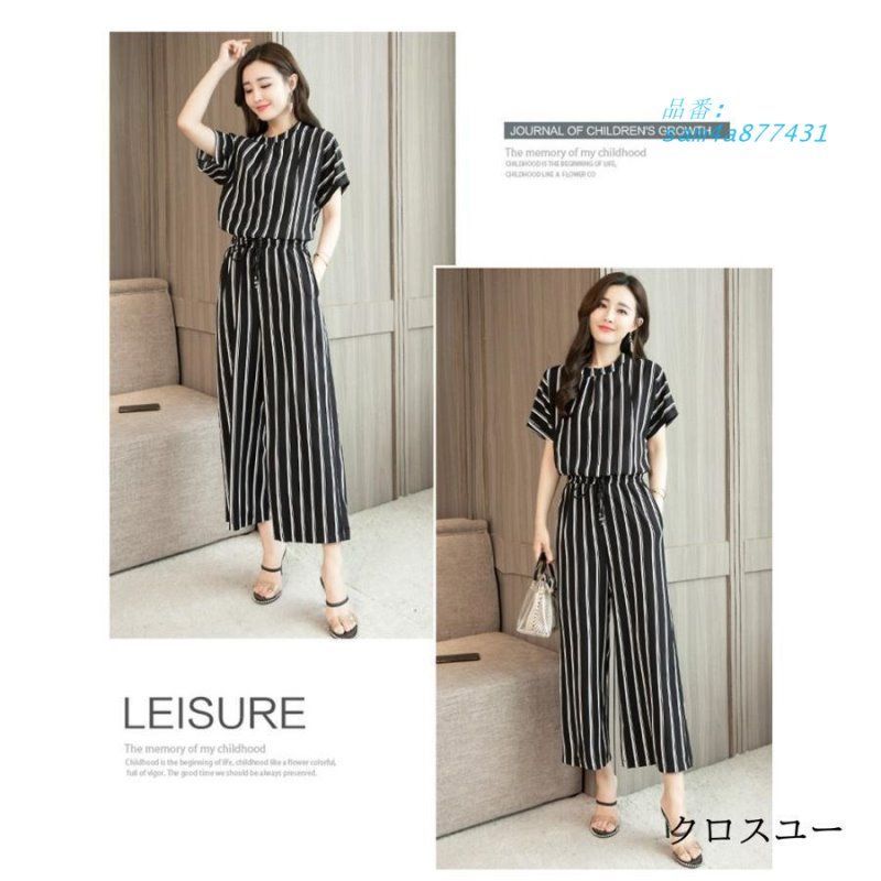 セットアップ レディース ワイドパンツ 夏 ブラウス 半袖 9分丈 40代 ガウチョパンツ ストライプ ゆったり 2点セット ウエストゴム am4a877431 BLACKFEMALETHERAPIST_ORG