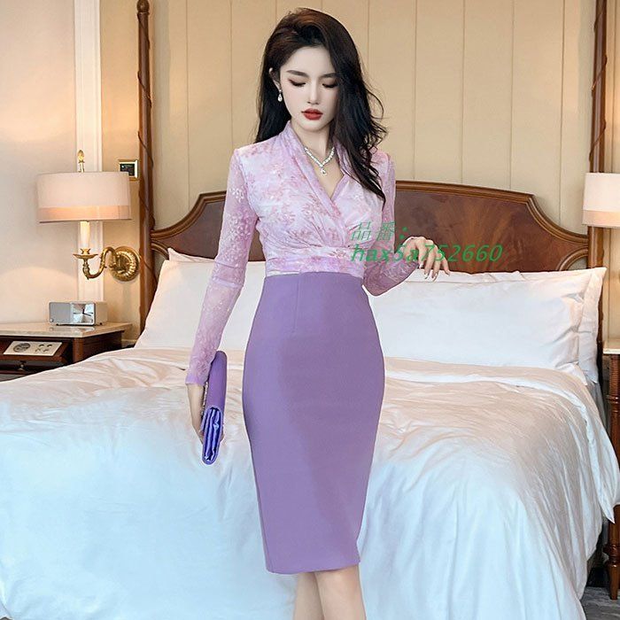 ハイウエスト切り替え カシュクールVネック長袖膝丈タイトワンピース 紫 キャバ スナック ラウンジ 服 韓国 レディース hax5a752660 BLACKFEMALETHERAPIST_ORG