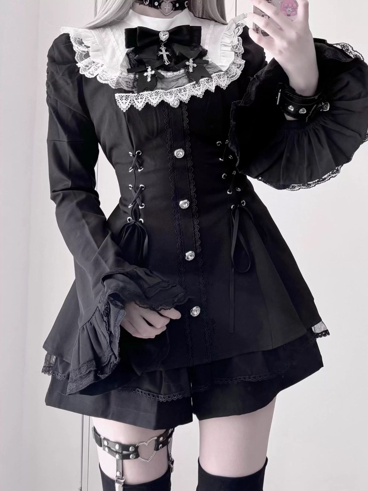 ゴシック ロリータ サブカル ワンピース セットアップ レース ベール 十字架 ネックレス付き ブラック 修道女風 コスプレ 衣装 ダーク アイドル 地雷系 病みかわいい モード 原宿系 長袖 フ ショート丈 スカート 黒 韓国ファッション BLACKFEMALETHERAPIST_ORG