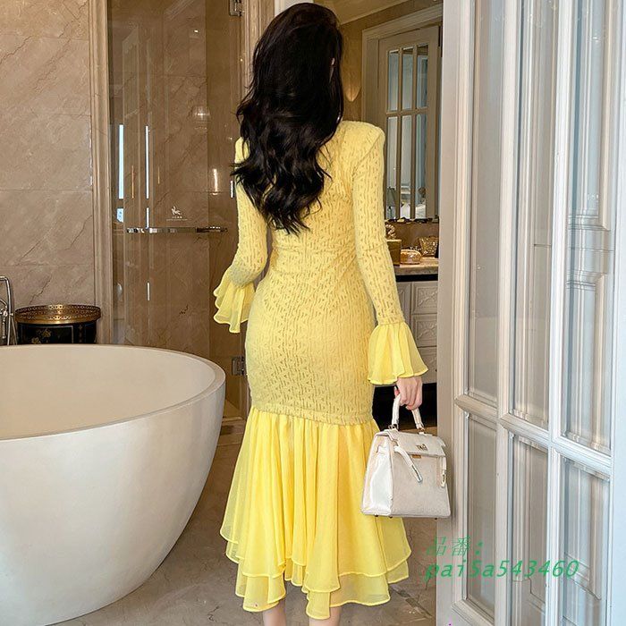 シースルーフリル長袖 ミモレ丈マーメイドドレスワンピース 黄 パーティー ドレス おしゃれ レディース 韓国 きれいめ pai5a543460 BLACKFEMALETHERAPIST_ORG