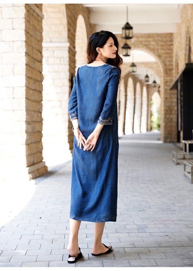 秋 レトロワンピース レディース ワンピース デニムワンピース 刺繍 エスニック レトロ ゆったり 体型カバー ミモレ丈 ロング 七分袖 着痩せ きれいめ 大人カジュアル おしゃれ ブルー 30代 40代 50代 BLACKFEMALETHERAPIST_ORG