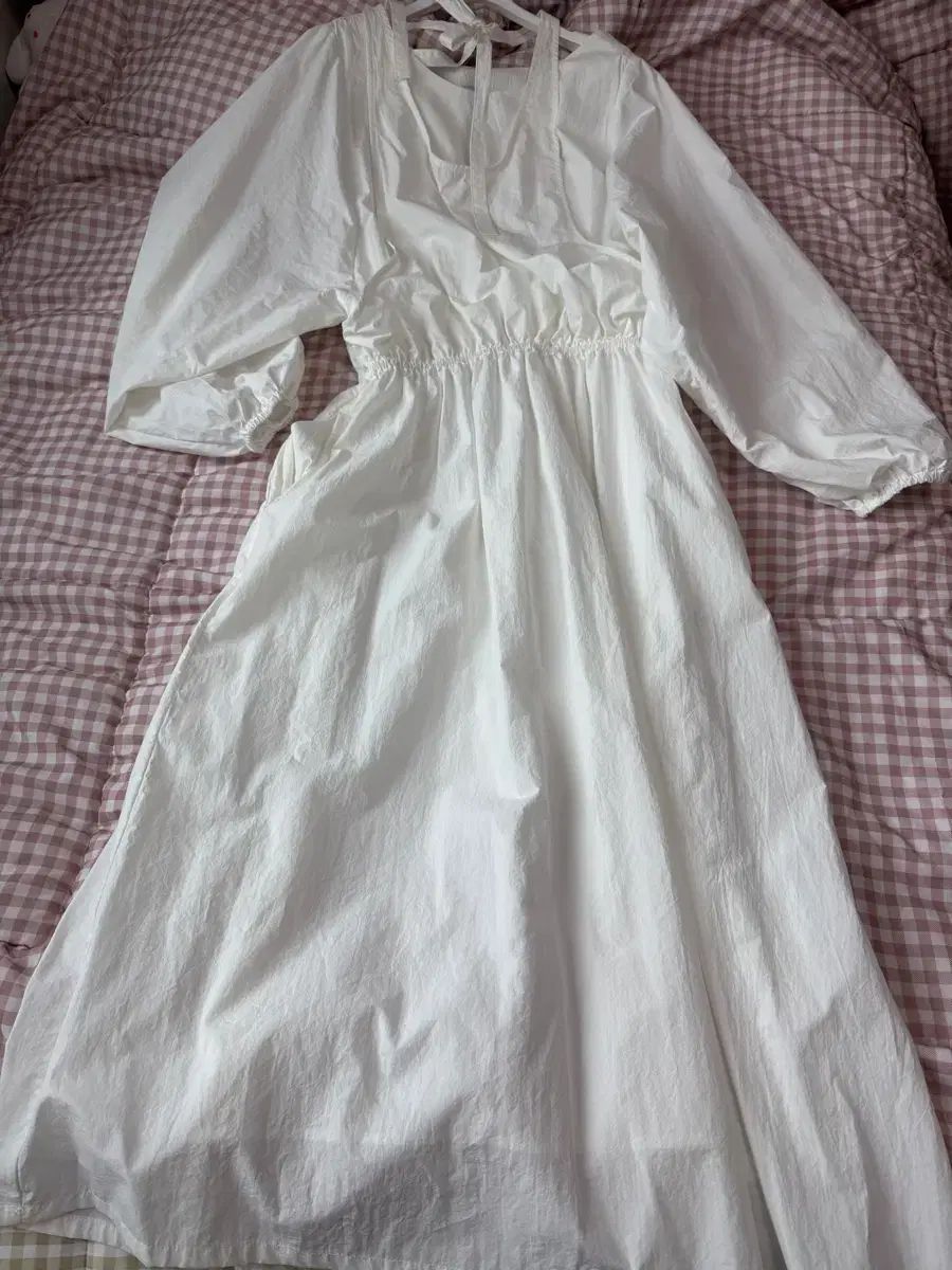 ADAM ET ROPE リネンボリュームスリーブワンピース ブラウンロングワンピース キーネック