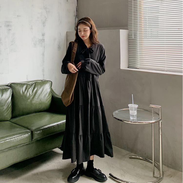 長袖 レディース 無地 かわいい ロング丈 Aライン シンプル デート 着 せ カジュアル ワンピース 体型カバー リボン ボウタイ ネック 膝下丈 ミモレ丈 きれいめ 大人女子 フ おしゃれ cjfj145380 BLACKFEMALETHERAPIST_ORG
