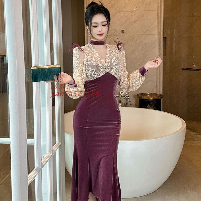 シースルーレース花柄長袖 マーメイドベロア ロングタイトドレスワンピース 紫 キャバ スナック パーティー 服 韓国 レディース yan5a571566の検索結果