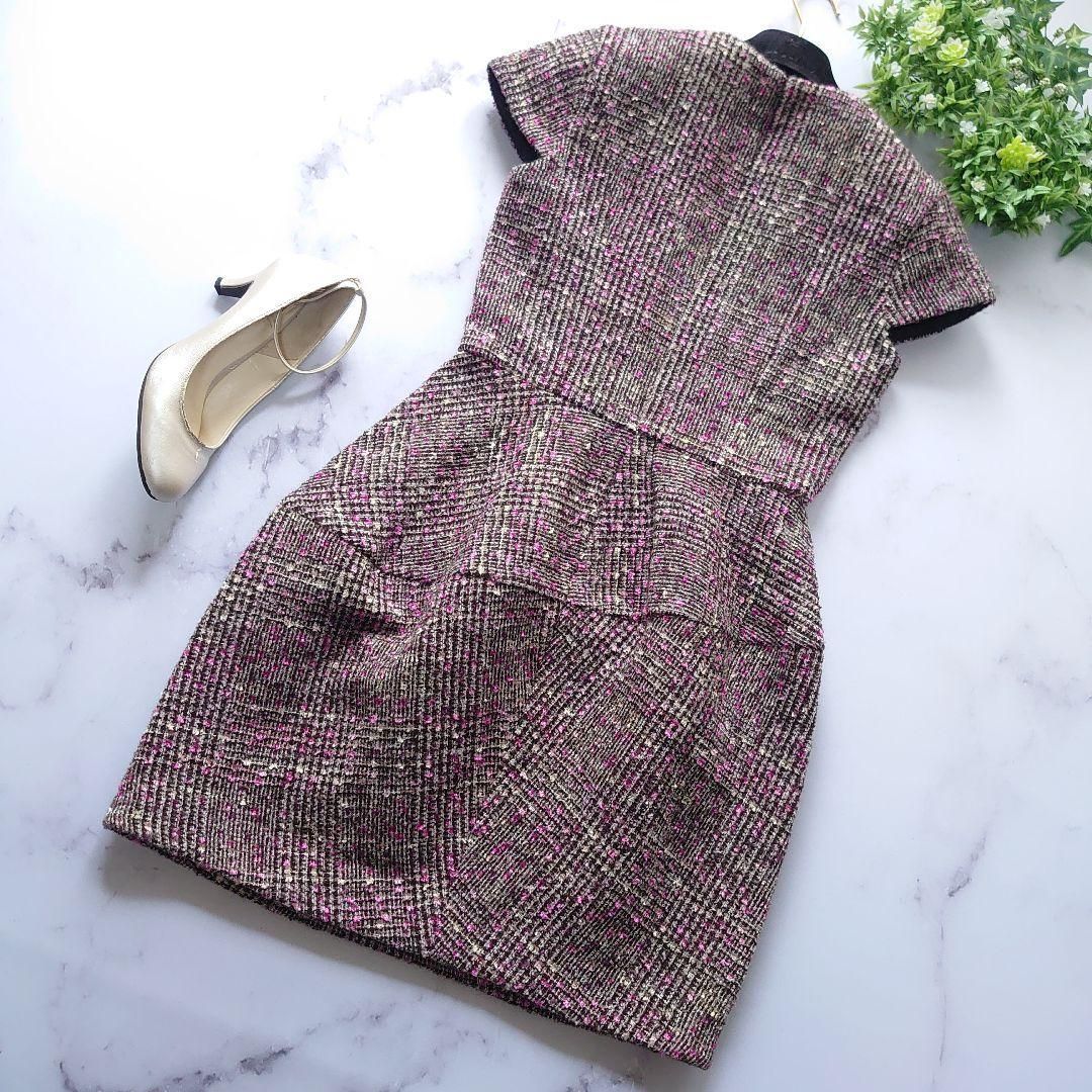 19AW YOKO CHAN ヨーコチャン Tweed Baroon Dress ミックスツイード バルーン ドレス ワンピース 半袖 キャップスリーブ クルーネック 半袖 膝丈 タック ブラウングレー ピンク マルチ 36 S BLACKFEMALETHERAPIST_ORG