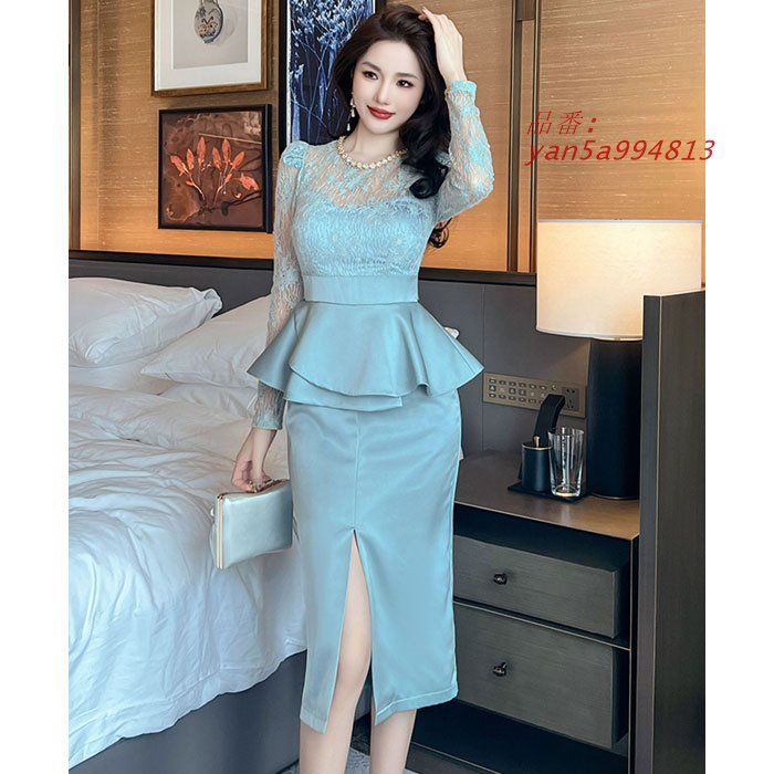 シースルーレース長袖 膝丈ペプラムタイトスカートドレスワンピース 水色 キャバ スナック 結婚式 レディース 韓国 ドレス おしゃれ yan5a994813の検索結果