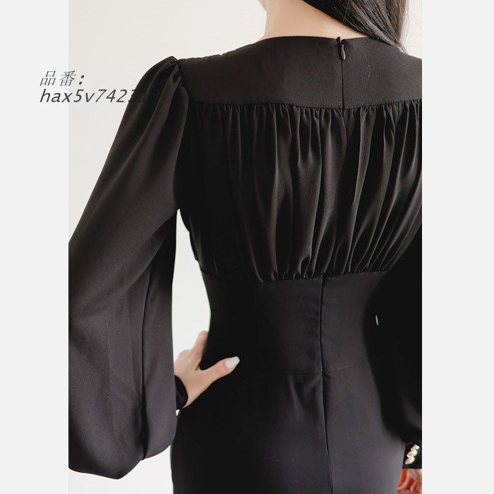 Vネック胸元 シースルーレース長袖 ベルベットミモレ丈タイトワンピース 黒 結婚式 お呼ばれ 韓国 パーティー ドレス kni4a558965