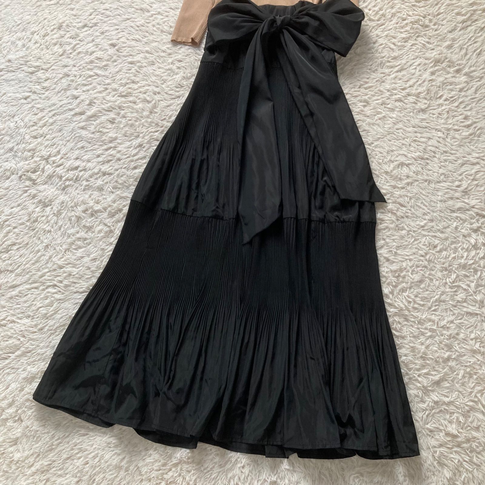 FURFUR ファーファー 大人レディなリボン付ニットコンビプリーツワンピース マキシ丈 フリーサイズ 黒 ブラック ベージュ レーヨン 上品 デートにおすすめ BLACKFEMALETHERAPIST_ORG