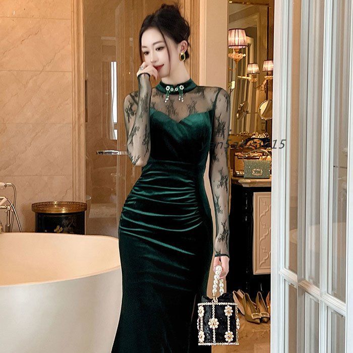 シースルーレース長袖 深スリットベロア ロングタイトドレスワンピース 緑 セクシー キャバ パーティー レディース スナック ドレス 韓国 yan5a423615の検索結果