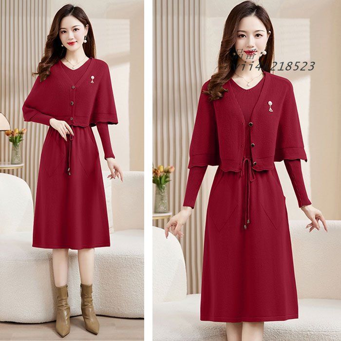 カーディガン風ケープ付き 膝丈長袖ニットワンピース 赤 カーキ 茶 カジュアル デート 韓国 レディース 服装 vii4w218523の検索結果