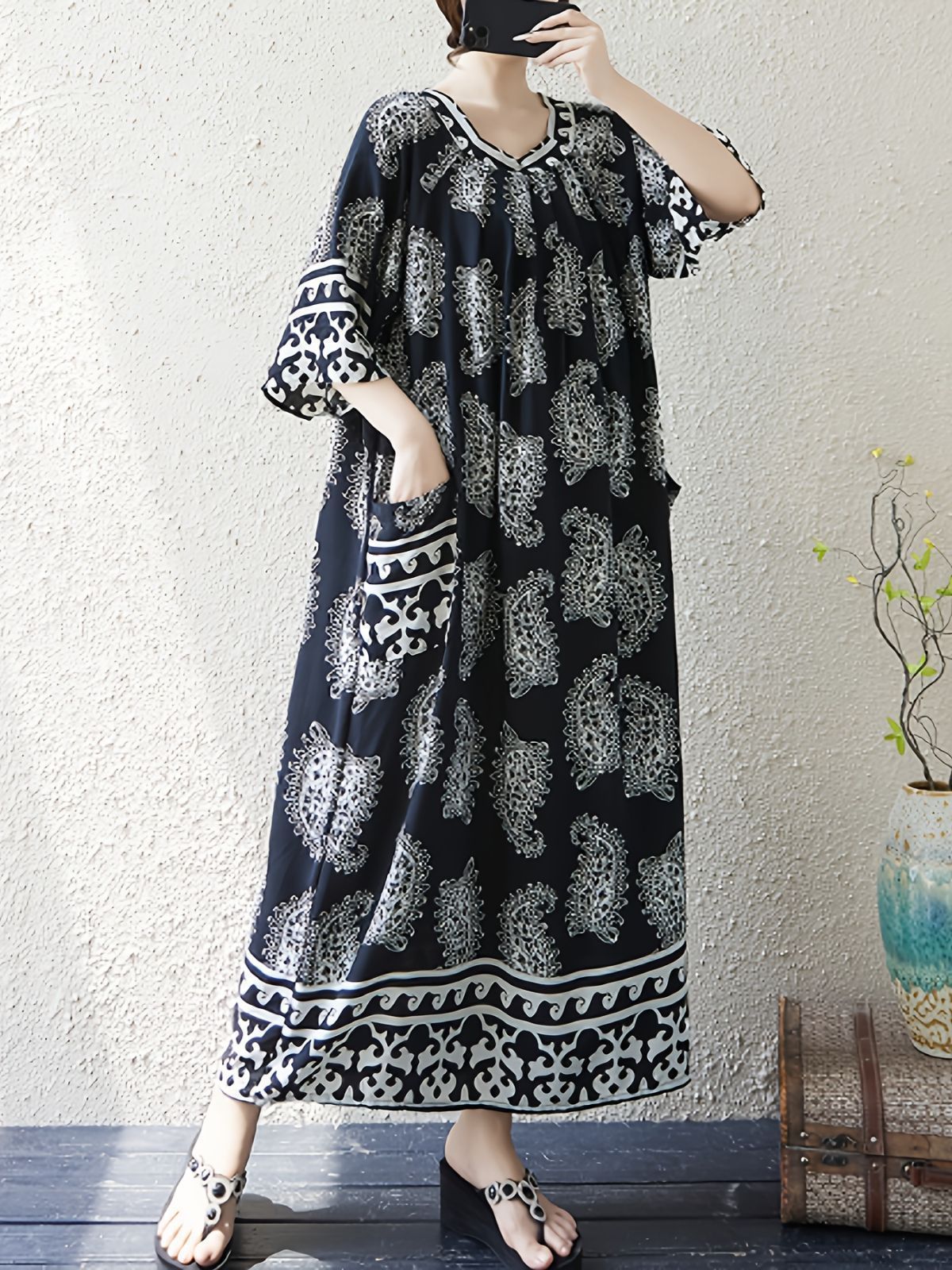 レディース 大きいサイズ ボヘミアン風 エスニックプリント ルーズフィット 半袖ローブ 軽量 通気性 ラウンドネック ポケット付き 春夏秋 カジュアル ホームウェア 快適ラウンジウェア ボホスタイル ドレス ラスティックエステティック BLACKFEMALETHERAPIST_ORG